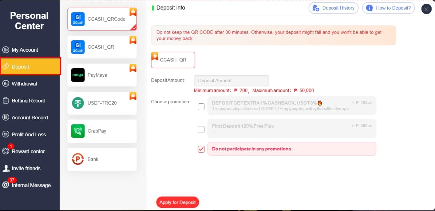 After logging in, go to the "Personal Center" area, which contains "Deposit" and all the other important account-related settings.